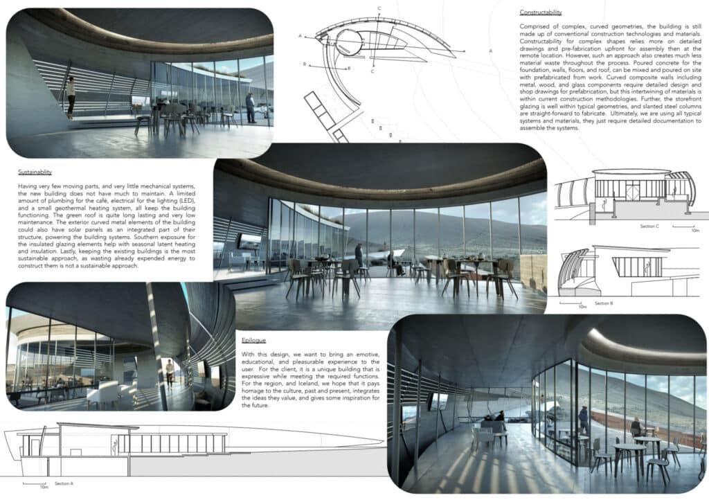 Rooted in Iceland’s volcanic earth and Viking heritage, the visitor center rises from the landscape like a warrior from myth—sword, shield, and sail embodied in form and material. Drawing inspiration from the green roofs of earthen homes, the hulls of seafaring ships, and protective armaments, the design blends culture and function to create wind breaks, pathways, shelters, and gathering points. This building is not just a structure—it’s a gesture that honors the past while offering an experience grounded in the present and oriented toward the future.